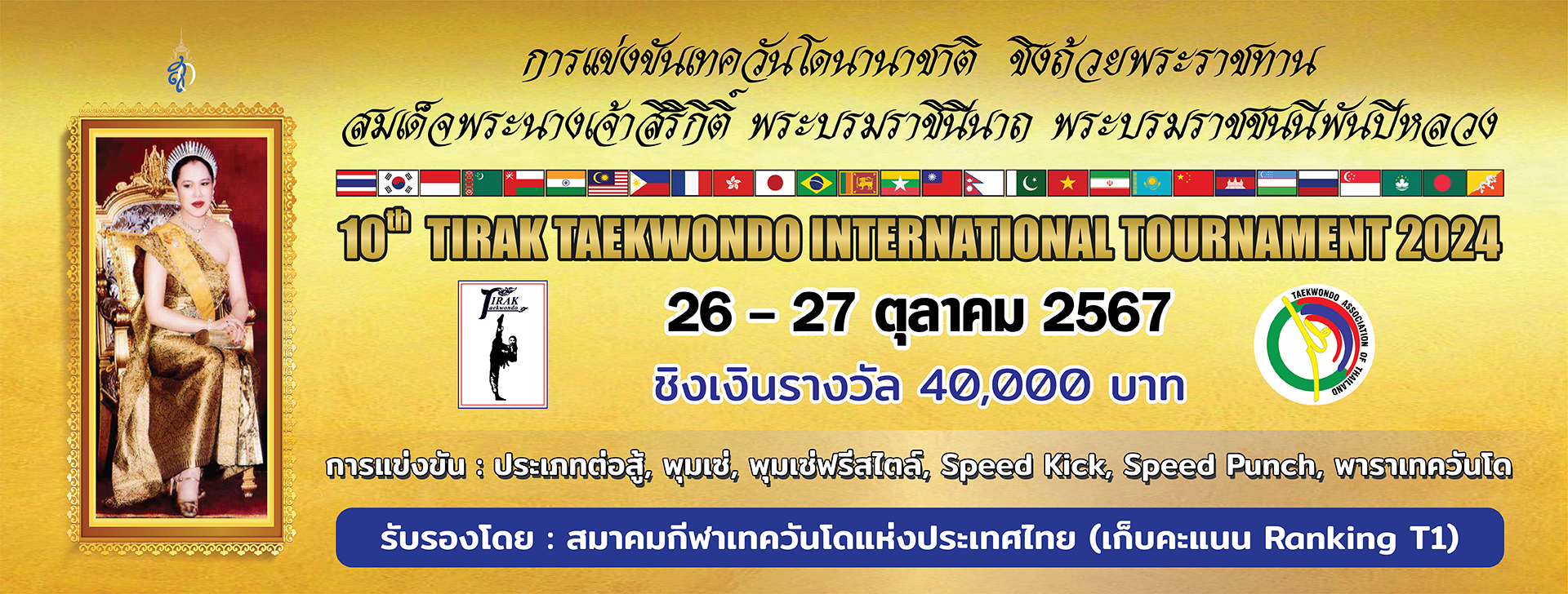 Tirak Taekwondo holds an annual international Taekwondo competition with the purpose of letting both Thai and International Taekwondo athletes to gain experience and exchange techniques. As of the recent year, there were 1,390 participants from 28 countries at Her Majesty Queen Sirikit The Queen Mother of Thailand's Challenge Cup 10th Tirak Taekwondo International Tournament 2024.